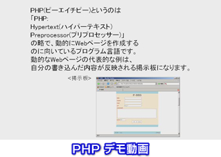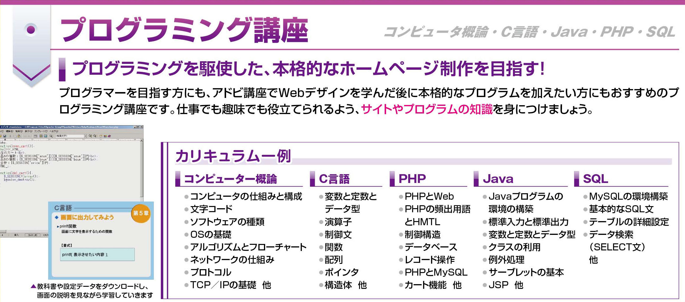 PHP講座では初歩的な文法、DB接続、セキュリティなどの広範囲な知識も習得し、Webプログラムの作成を学習します。